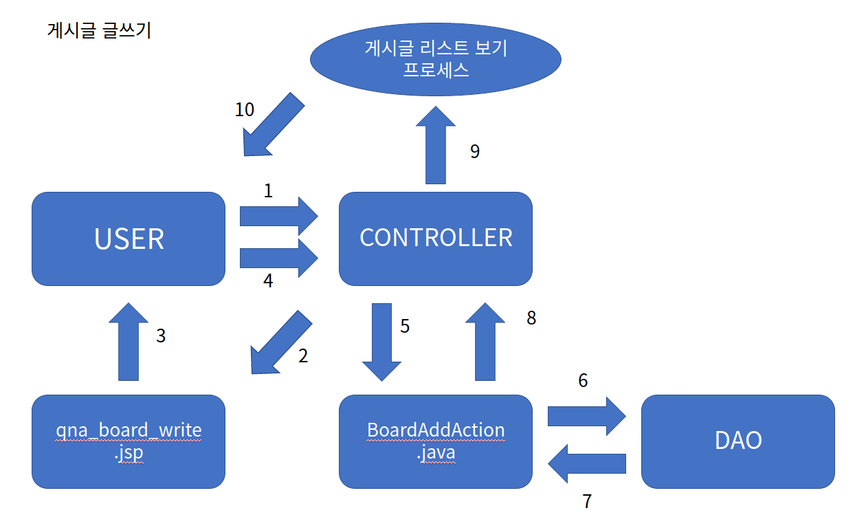 1. 사용자가 qna_board_list.jsp 페이지에서 글쓰기를 클릭하여 게시글을 작성할 것을 요청합니다. BoardWrite.bo URL로 이동합니다.