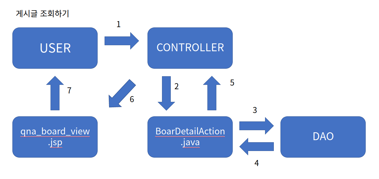 1. 사용자가 qna_board_list.jsp 페이지에서 게시글 제목을 클릭하여 그 게시글을 조회할 것을 요청합니다. BoardDetailAction.bo URL로 이동하며 해당 게시글 번호를 GET방식으로 넘겨줍니다.